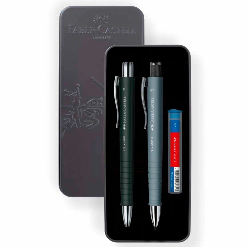 Kit Poly em lata com caneta esferográfica retrátil com traço médio de 1.0mm para escrita super macia & Lapiseira com ponta 0.7mm e avanço automático da mina com acabamento metalizado e borracha com sistema de extensão.
